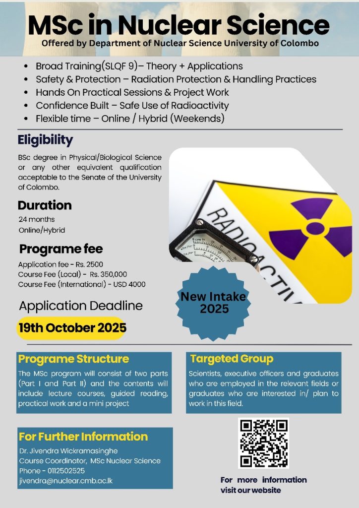 MSc Course in Nuclear Science was first set up in 1982 with the sponsorship of the Atomic Energy Authority of Sri Lanka. The main aim of this course was to meet the needs of the expanding fields of research and industrial applications of nuclear techniques in Sri Lanka.