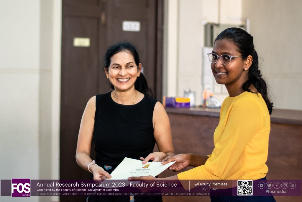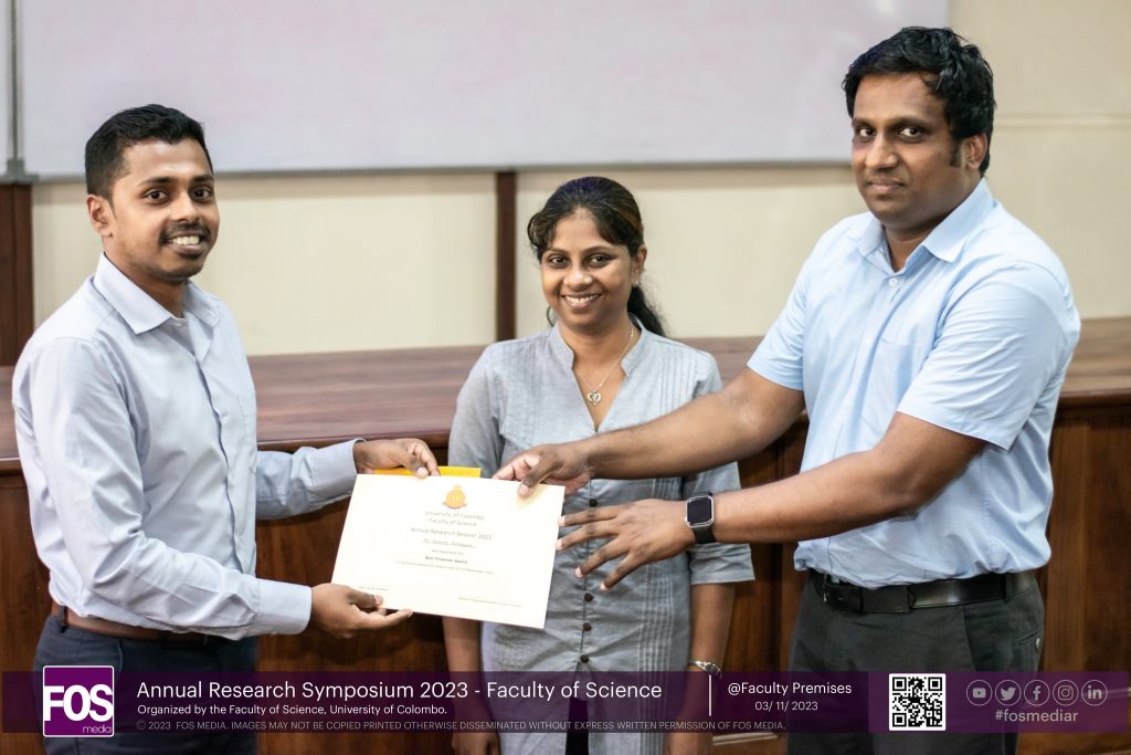 Thirty two research studies were presented under three technical sessions, namely Chemistry, Physical Sciences and Biological Sciences. The best presenter of each technical session was selected and awarded a certificate and a cash award. The best presenters of the three technical sessions are: