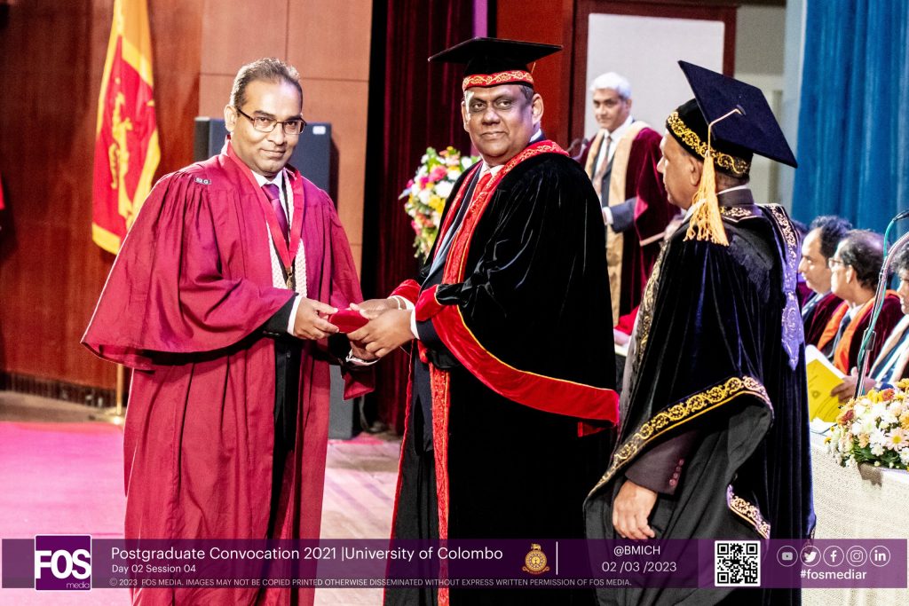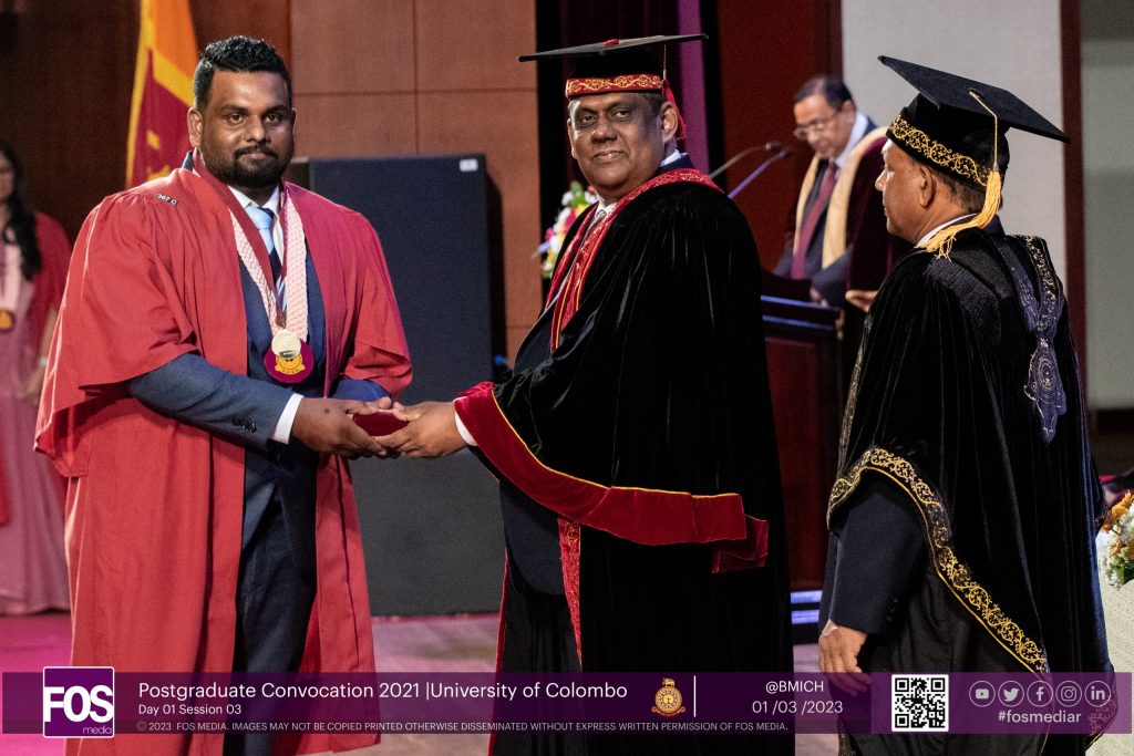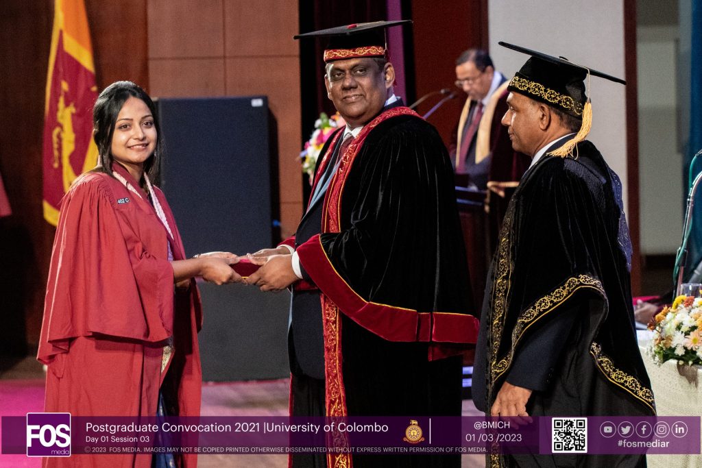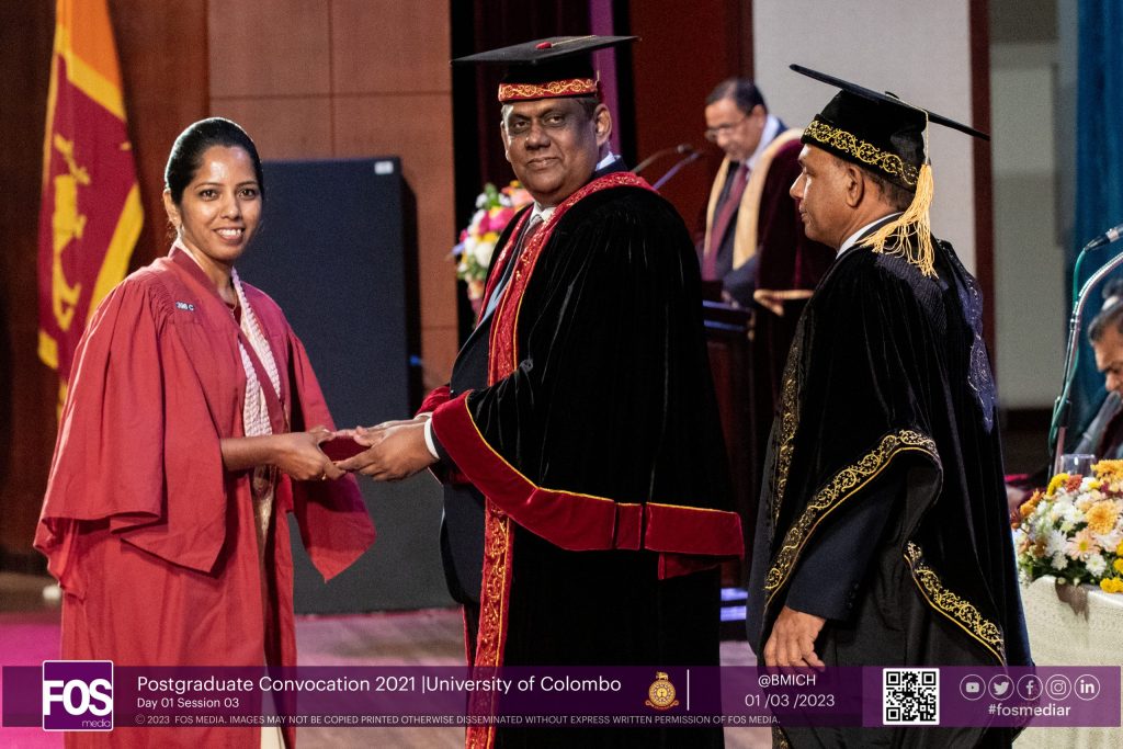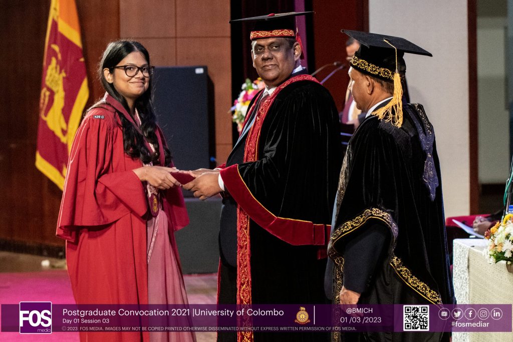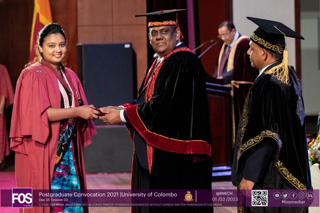 University of Colombo conducted its Postgraduate Convocation for the year 2021 at the Bandaranaike Memorial International Conference Hall on 01st and 02nd March 2023 under the patronage of the Venerable Chancellor, Sasana Keerthi Sri Buddha Sasana Shobhana Venerable Muruththettuwe Ananda Nayaka Thero, with the Vice Chancellor- Senior Professor (Chair) H.D. Karunaratne, Rector, Deans, Directors of the Institutes, Registrar, Acting Bursar, Acting Librarian, Heads of the Departments and Administrative and Finance Officers.