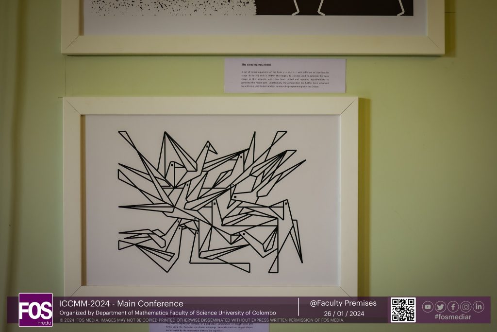As a part of a project that explores the relationship between mathematics, algorithms and visual arts, the Centre for Mathematical Modelling has been creating artworks by using mathematical formulae and algorithms. The Swaying Equations, an exhibition of mathematical and algorithmic art, that consisted of a number of artworks generated through this project took place on 26th Jan 2024, at the first floor of MF building, Faculty of Science, University of Colombo.