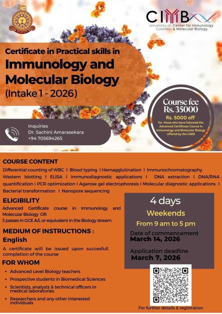 • wish to supplement their existing knowledge in biology (Eg: Advanced Level Biology students, Medical Lab Technicians etc.)